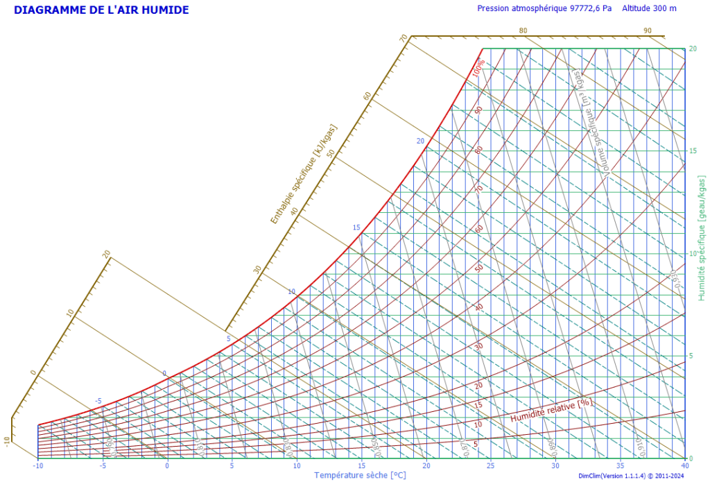Le graphique ci-dessous illustre ce comportement : il montre combien l’air chaud peut contenir davantage de vapeur d’eau que l’air froid. Ce phénomène explique la majorité des problèmes de condensation dans les logements. En hiver, l’air extérieur est très sec en humidité absolue. Une fois réchauffé dans le bâtiment, il devient encore plus sec. À l’inverse, l’air intérieur chargé en humidité se refroidit parfois localement sur les parois, atteignant la saturation et créant de la condensation ou des moisissures.